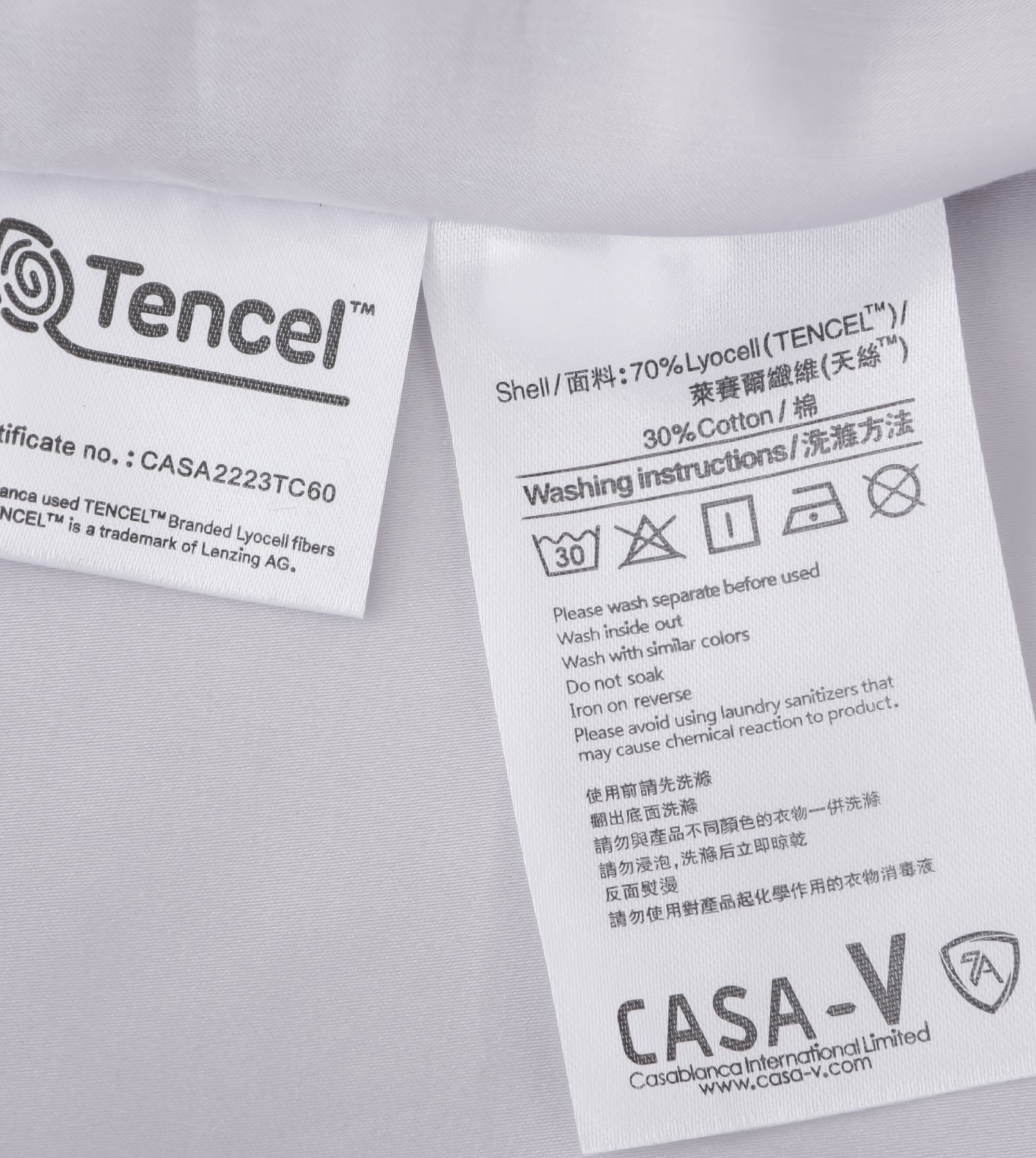 CASA-V 7A 1300針幻影絲素色系列 巧妙結合70%天絲與30%純棉2大天然纖維的完美比例而成,將柔軟順滑與強韌耐用兩者優點二合為一,令觸感柔軟如絲綢,同時擁有絕佳的濕氣傳導,不因經常與肌膚磨擦而令皮膚失去表層水份,幫助調節肌膚濕度,為你打造床品中的 Masterpiece。除了以清雅素色色調為主外,此系列加入了7A級物理抗菌科技,其功能包括7A級抗菌、分解芳香胺、全面防蟎、安全防臭、有效防霉、對抗病毒及持久恆溫七大功能,守護您和至愛的每一夜,享受健康、安全的睡眠環境。 完美結合 自家研發的黃金比例,精妙地將純棉材質及天絲混合,完美結合絲的柔軟順滑和棉的強韌耐用,兼備矜貴質感和實用性。 環保耐用 棉纖維的回彈性高,天然透氣,而且纖維強韌,耐洗耐用,物超所值。 四季合適 不論在乾冷的秋冬、還是濕熱的春秋都一樣宜人,清爽親膚,質感於一年四季都帶來最舒適感受。 高抗皺性 天絲質感柔軟光滑,且有高度抗皺性和懸垂性,絲一般的華貴外觀深受廣大用家歡迎。 7A級物理抗菌科技 7A級抗菌、分解芳香胺、全面防蟎、安全防臭、有效防霉、對抗病毒及持久恆溫,享受健康、安全的睡眠環境