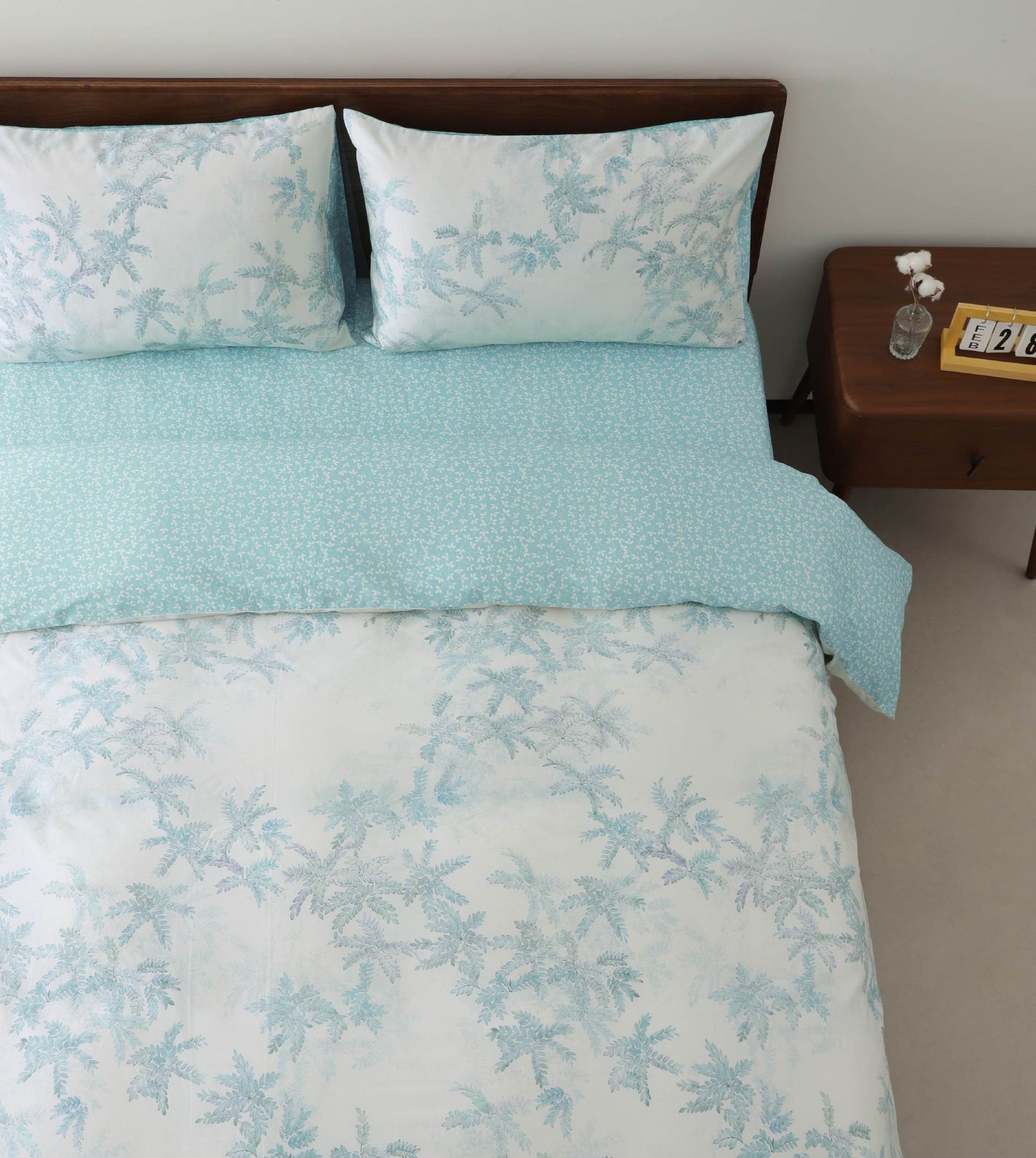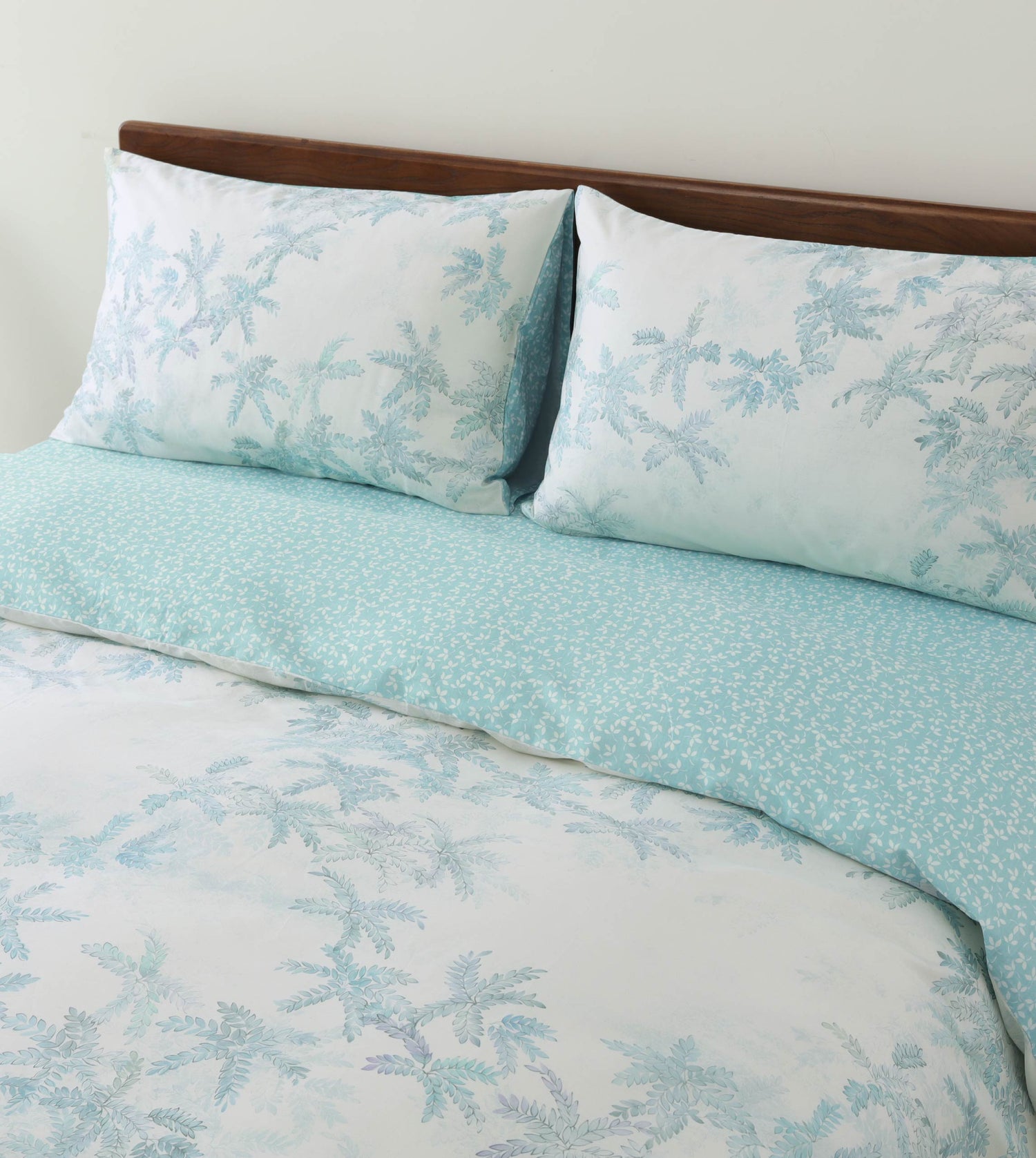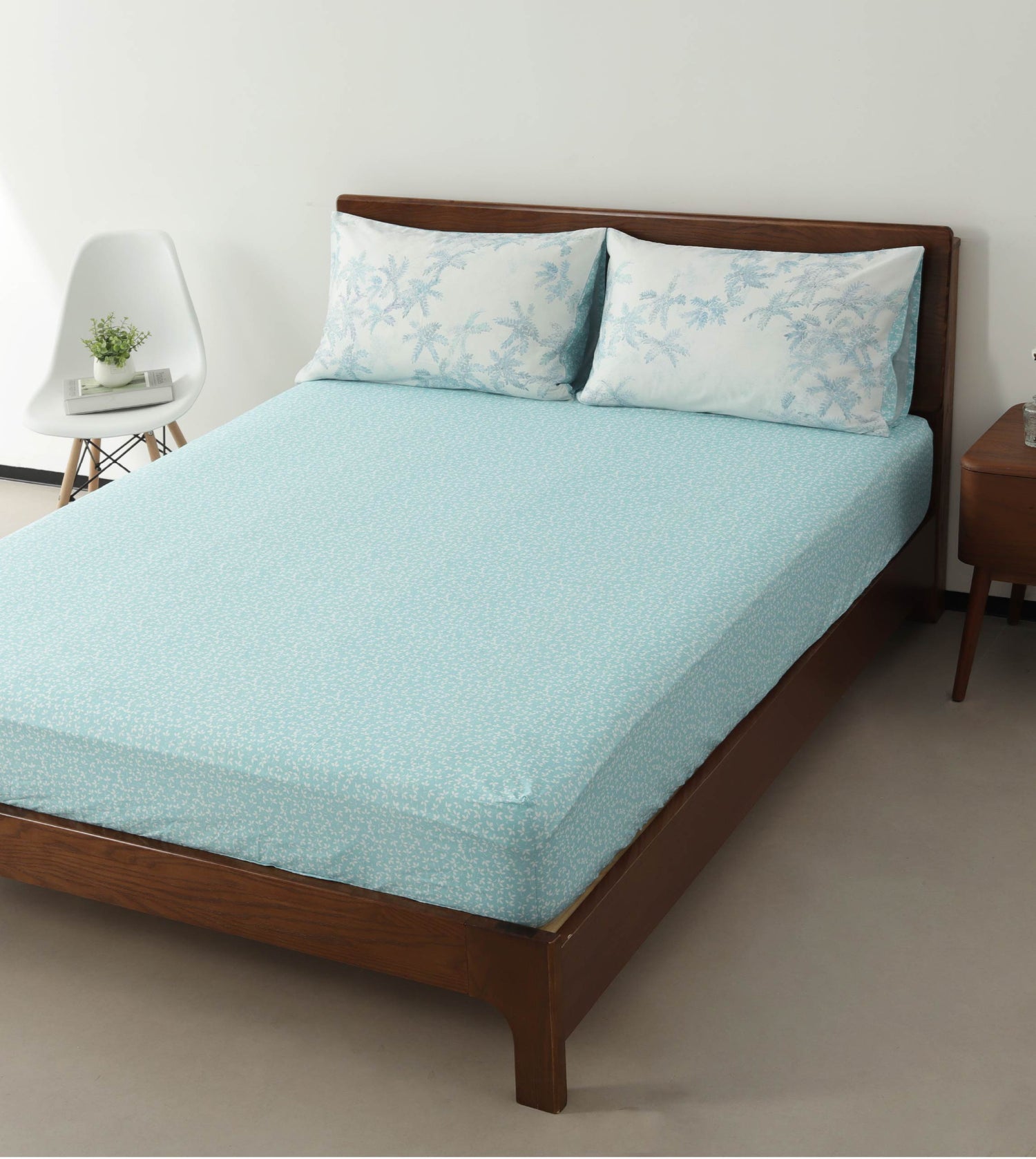 **The fitted sheet in the Product Type 'bedding set' is blue; the fitted sheet in the Product Type 'fitted sheet with pillowcases' is white with floral patterns.